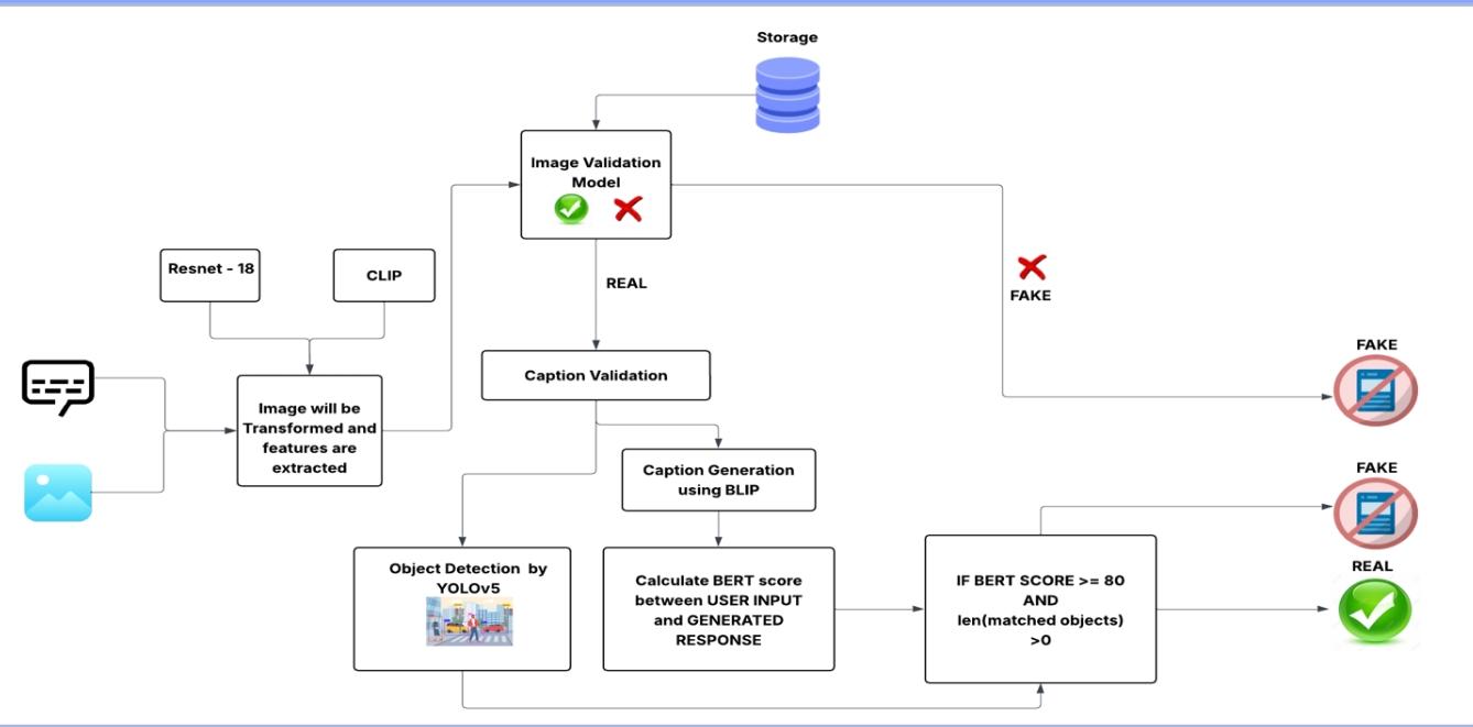 Developed a multimodal detection system combining vision and language models to identify misinformation across text and image content. Integrated ResNet-18 for image feature extraction, CLIP and BLIP for cross-modal alignment, and BERT for textual analysis. Achieved 95% detection accuracy through ensemble fusion of modality-specific predictions. Designed the pipeline to handle real-world content where manipulated images are paired with misleading text.